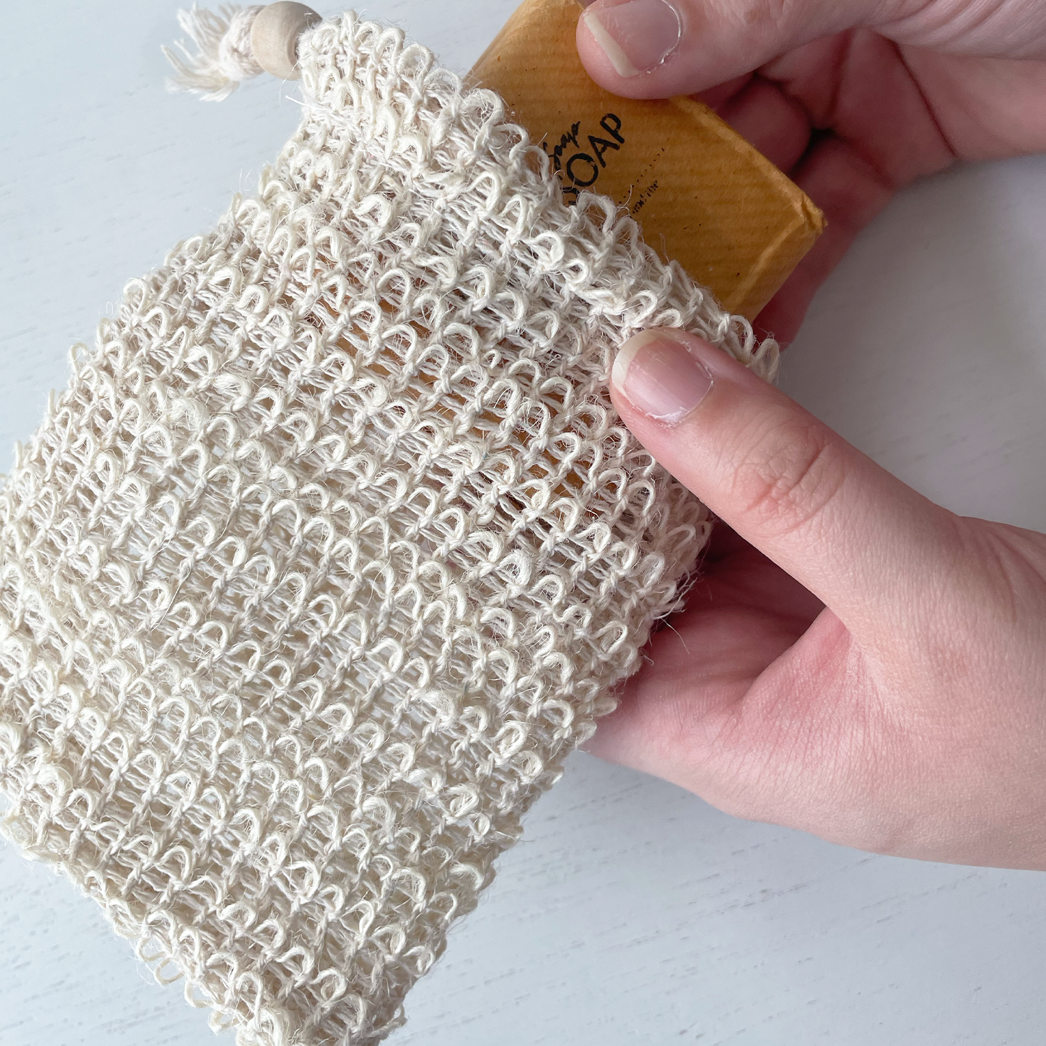 Crafted from 100% cotton, this natural sisal soap bag offers excellent exfoliation and foaming in the bath. With an outer open mesh surface and a softer inner weave, it caters to those seeking both gentle scrubbing and effective cleansing. Plus, it's perfect for holding leftover soap bits, reducing waste as it's fully biodegradable.